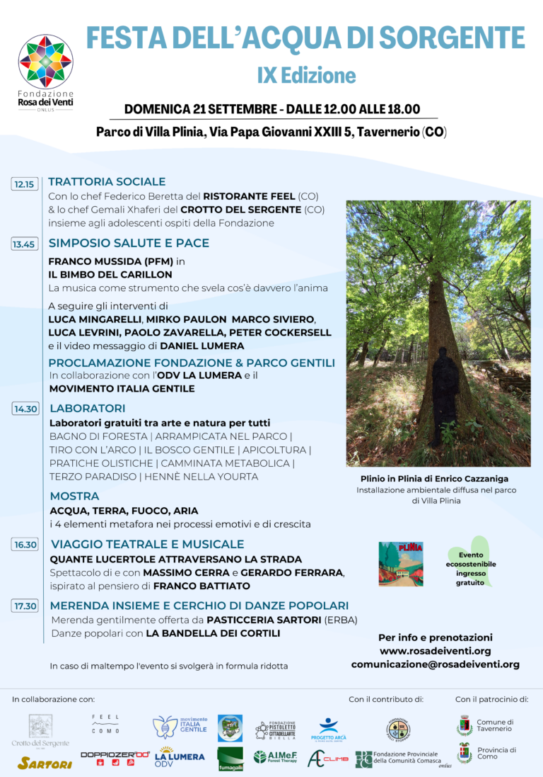 Domenica 21 settembre 2025 torna la IX Festa dell’Acqua di Sorgente nel Parco di Villa Plinia a Tavernerio (CO), in occasione dell’equinozio d’autunno: una giornata aperta a tutta la comunità, dedicata alla natura, all’arte, alla salute e all’incontro. Ad aprire la giornata sarà l’attesa Trattoria Sociale, guidata dagli chef Federico