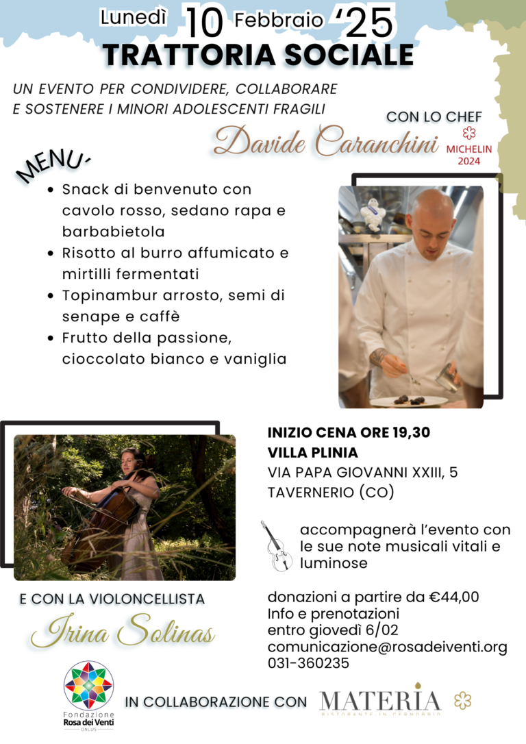 Lunedì 10 febbraio alle ore 19.30, presso Villa Plinia a Tavernerio, torna l’appuntamento con la Trattoria Sociale della Fondazione Rosa dei Venti onlus, con la partecipazione dello chef stellato Davide Caranchini, del ristorante Materia di Cernobbio. La parola chiave della serata sarà “Pianeta”, una delle cinque “P” dell’Agenda 2030, insieme