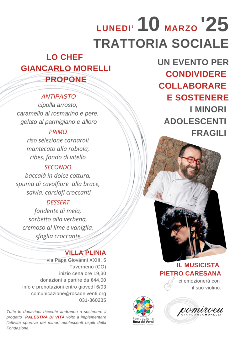 Prosegue la rassegna delle Trattorie Sociali della Fondazione Rosa dei Venti onlus. Il prossimo appuntamento è lunedì 10 marzo alle ore 19.30, presso Villa Plinia a Tavernerio, con lo chef Giancarlo Morelli, del ristorante Pomiroeu di Seregno (MB). Morelli tornerà nelle cucine della Fondazione per guidare i ragazzi nella preparazione