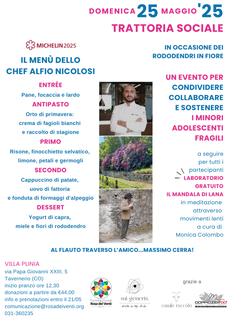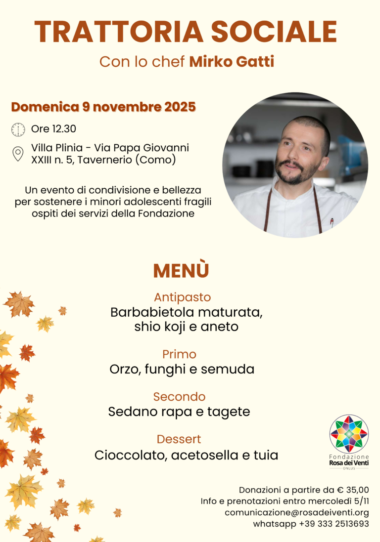 L’autunno porta con sé profumi di terra, colori caldi e desiderio di stare insieme. In questo spirito nasce la Trattoria Sociale d’Autunno della Fondazione Rosa dei Venti: un pranzo speciale in cui il cibo diventa occasione di incontro, condivisione e crescita. Protagonista della giornata sarà lo chef Mirko Gatti, cuoco